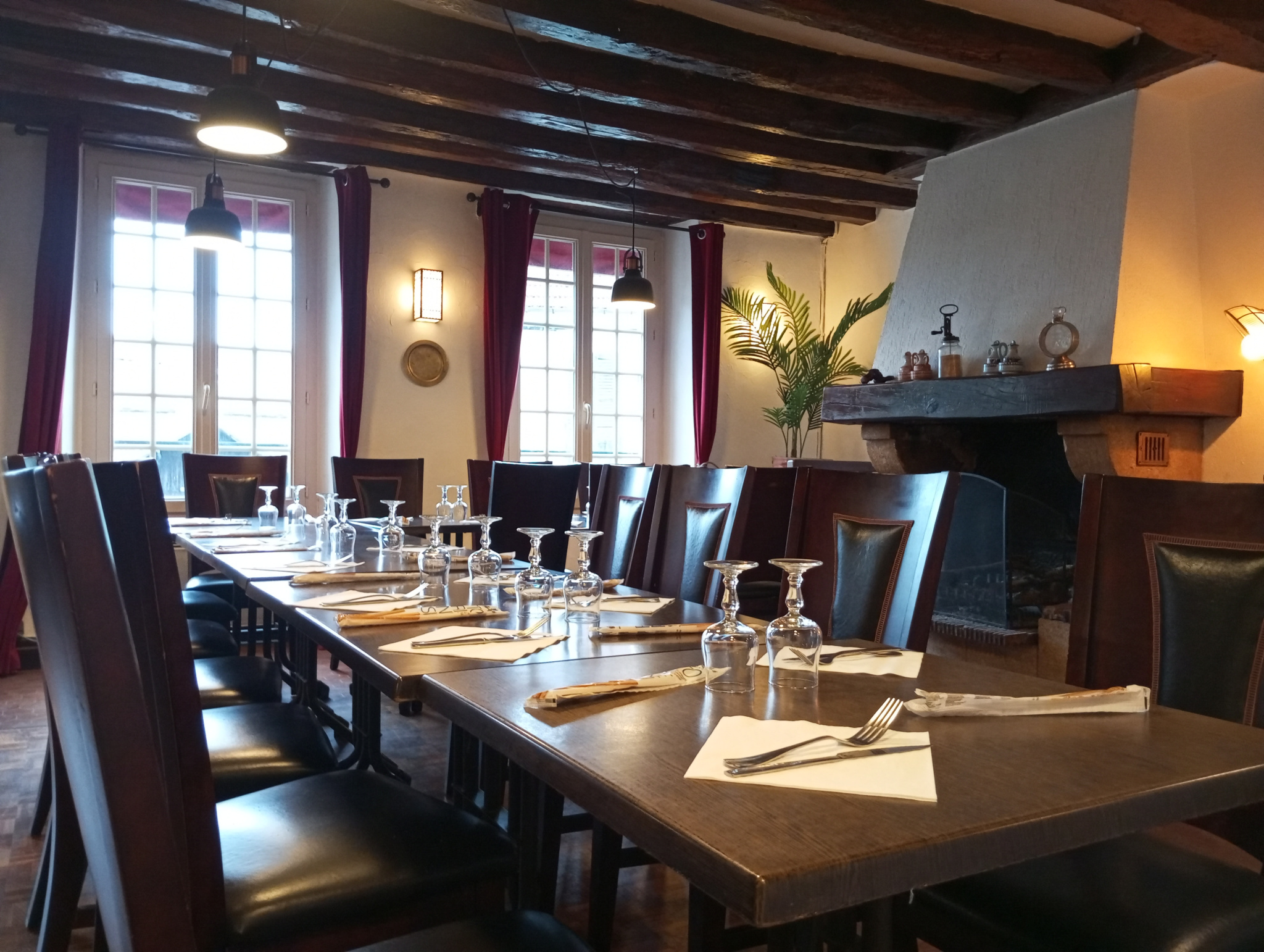 Étage : atmosphère d’auberge avec cheminée, poutres apparentes et charme d’antan (28 couverts)