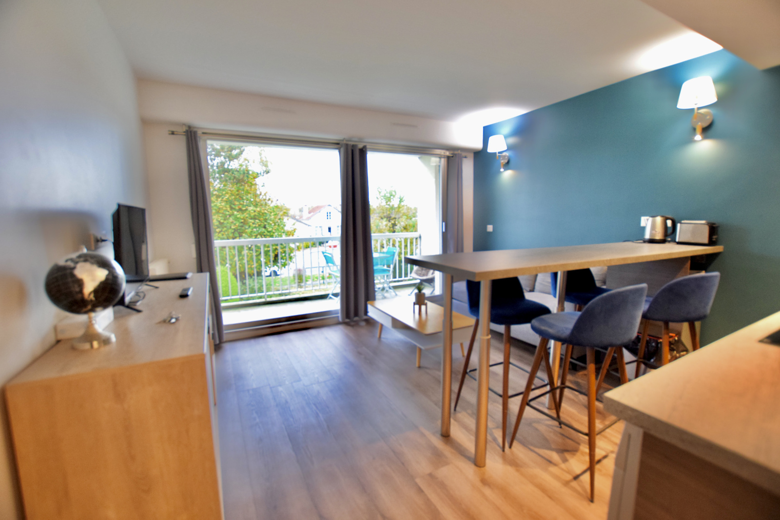 - Studio : Séjour avec accès au balcon, cuisine ouverte, salle d’eau avec WC.