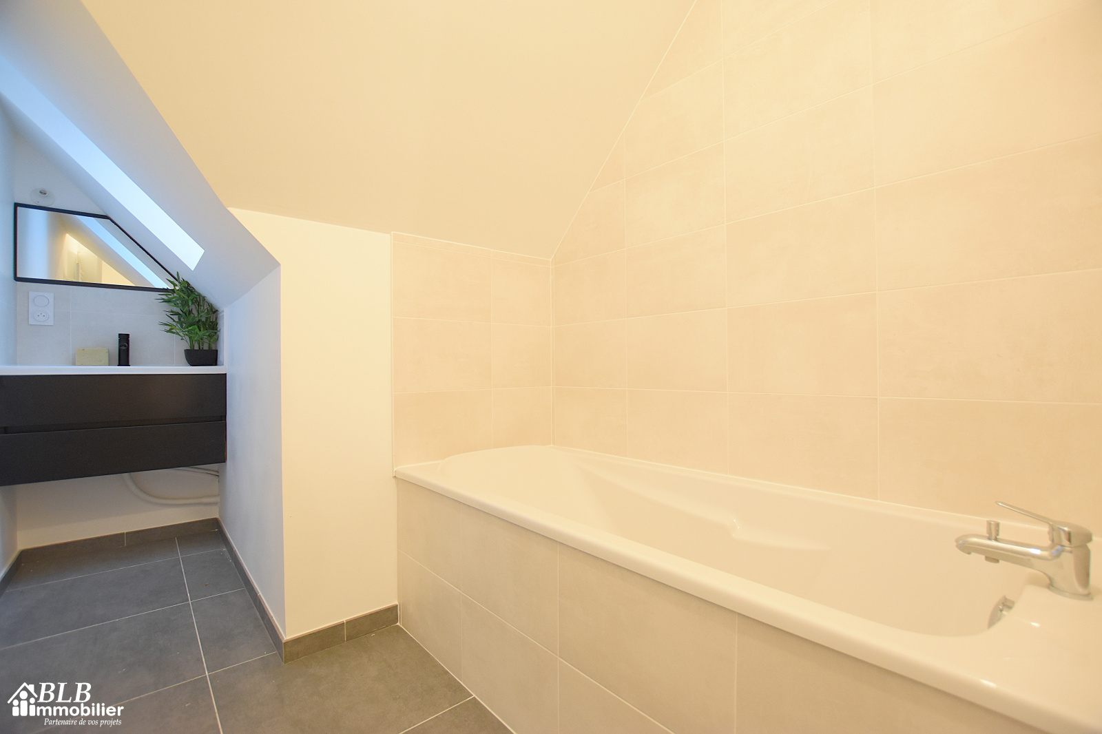 - Une salle de bains avec baignoire,