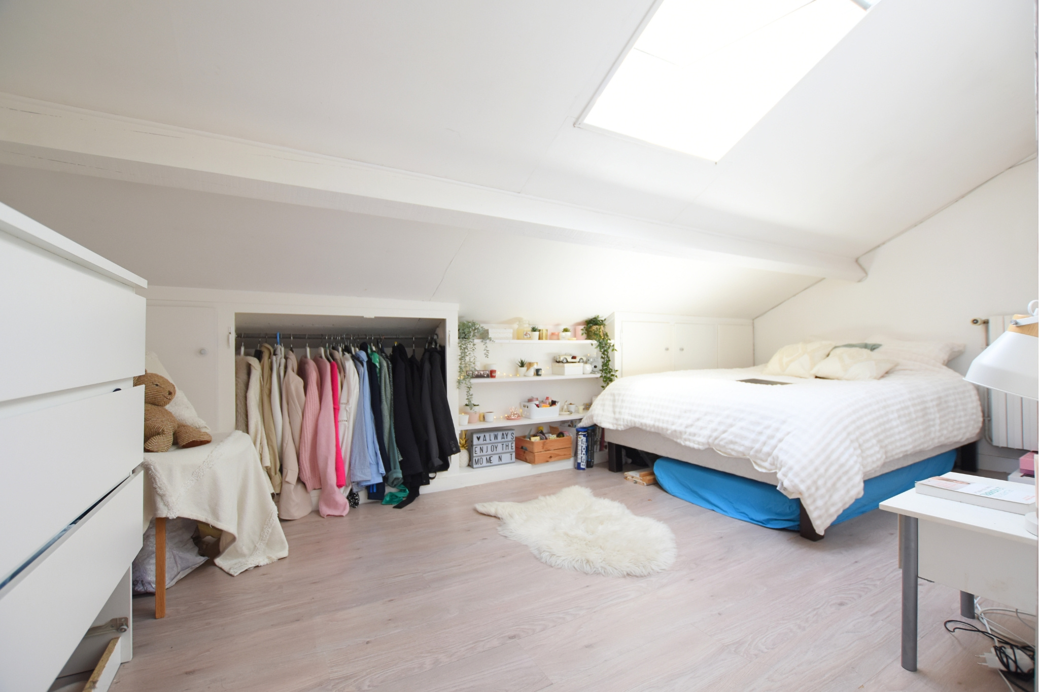 À l’étage, un palier dessert 2 chambres, dont une avec accès à une salle de bains avec WC. Un espace bureau est également présent, avec la possibilité de créer une 3e chambre selon vos besoins.
