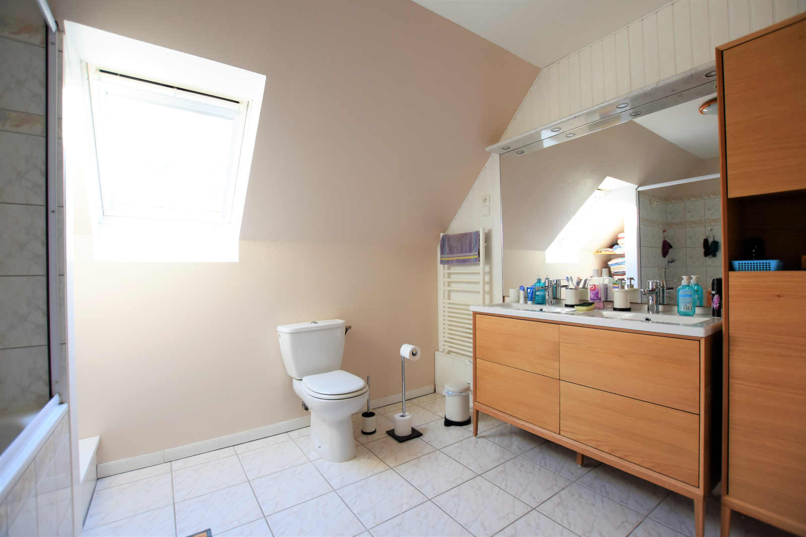 À l'étage, vous trouverez un palier desservant 3 chambres, dont 1 avec dressing (14.08 m²/10.79 m²/10.11 m²), 1 dressing/coin repassage indépendant (3.20 m²), 1 salle de bain doubles vasques et un WC.