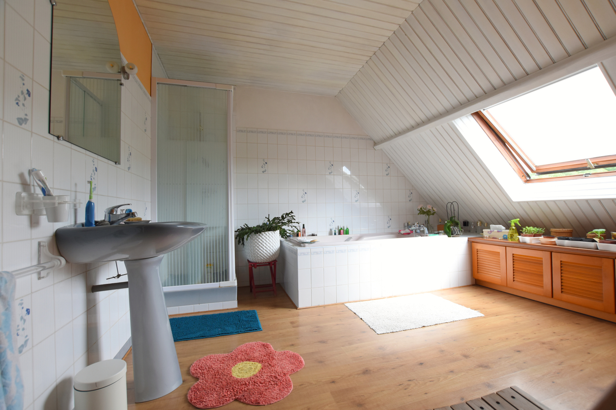 À l'étage, un palier avec placards dessert 3 Chambres (15.21m² au sol/11.26m² au sol/14.35m² au sol), ainsi qu' une SDB avec baignoire et douche.
