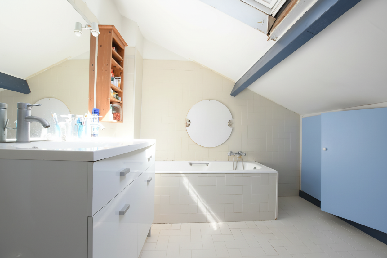 À l’étage, un palier dessert 2 chambres, dont une avec accès à une salle de bains avec WC. Un espace bureau est également présent, avec la possibilité de créer une 3e chambre selon vos besoins.