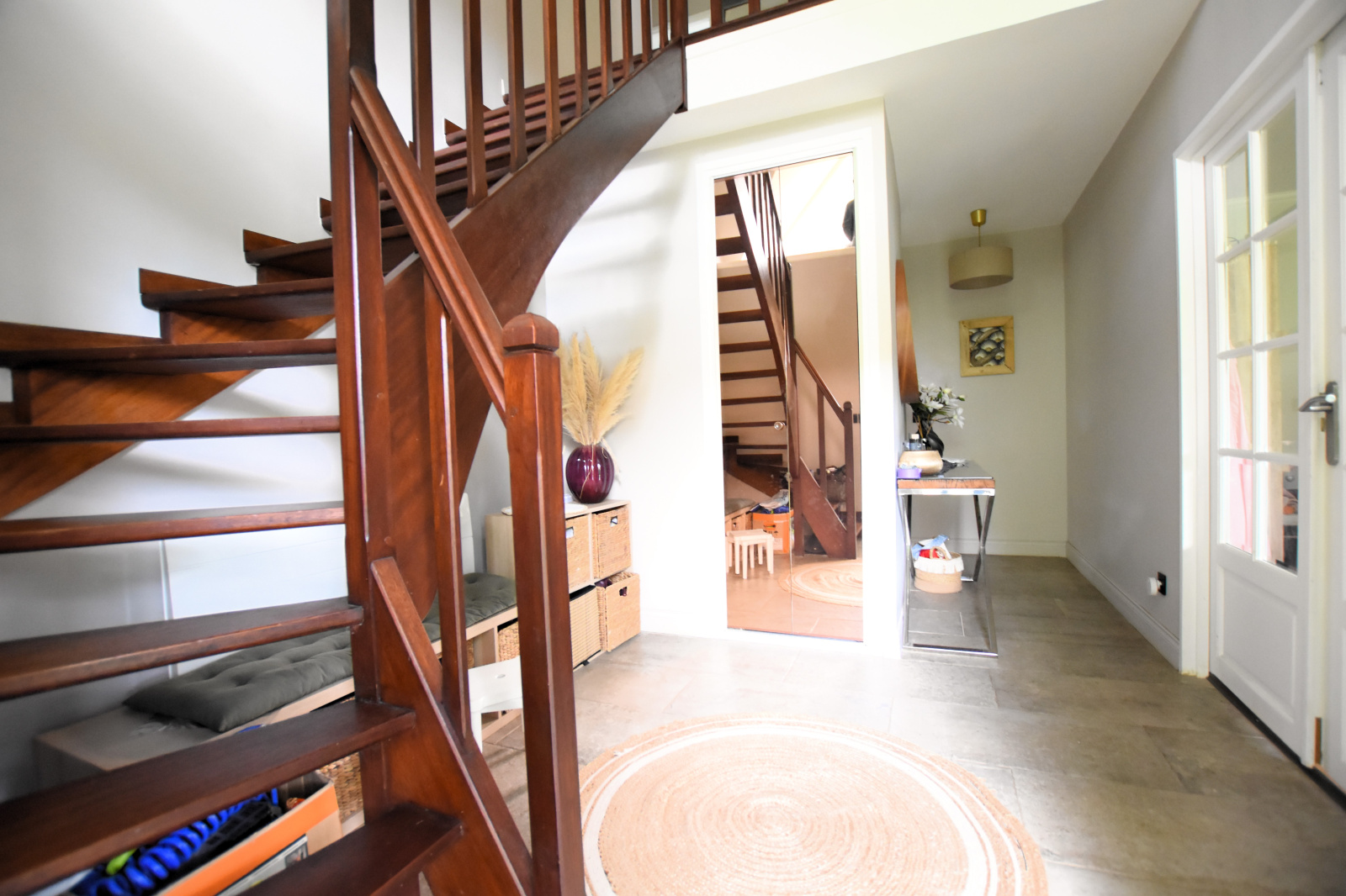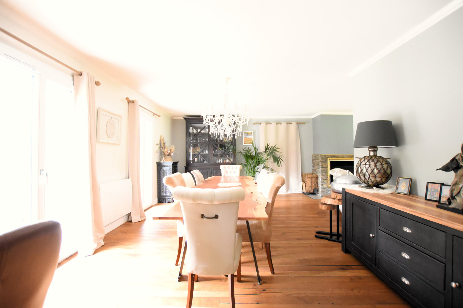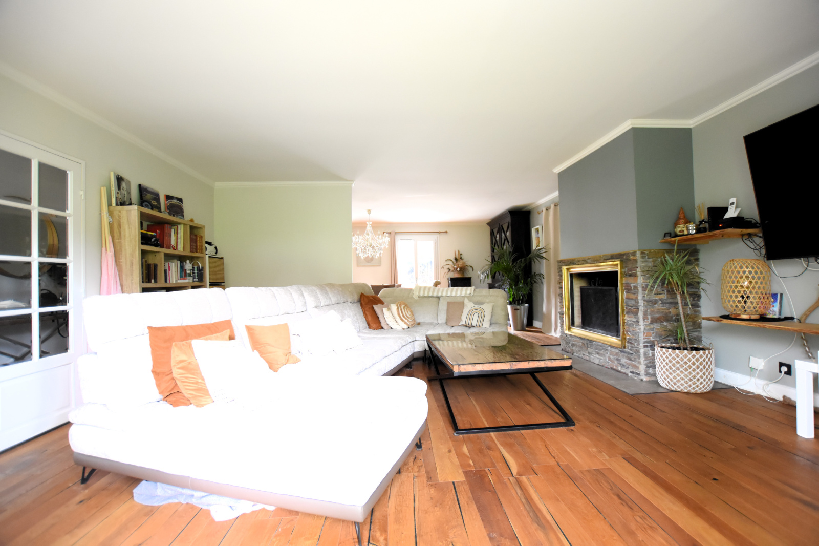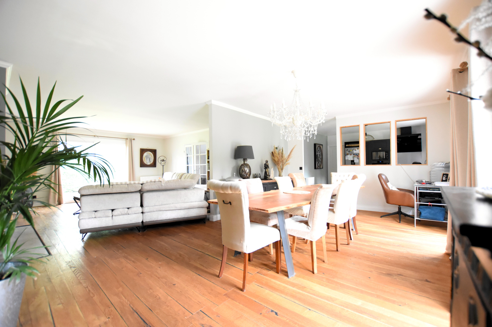Venez découvrir au Rez-de-chaussée : une grande entrée CATHÉDRALE, un SÉJOUR TRIPLE LUMINEUX avec cheminée de 53 m² vous offrant une TRIPLE EXPOSITION par 4 baies vitrées, une cuisine dînatoire équipée de 13,89 m², un Cellier/Buanderie et un WC indépendant avec lave-mains.