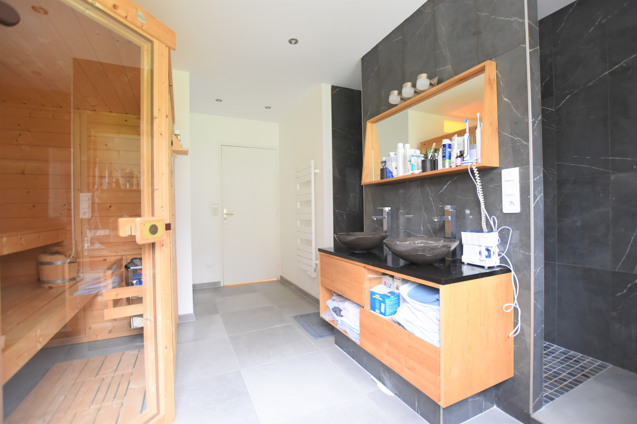 Un dégagement vous mène vers une salle d’eau moderne avec douche à l’italienne et sauna intégré, idéale pour des instants de détente, et 1 chambre confortable de 14,49 m² avec placard intégré.