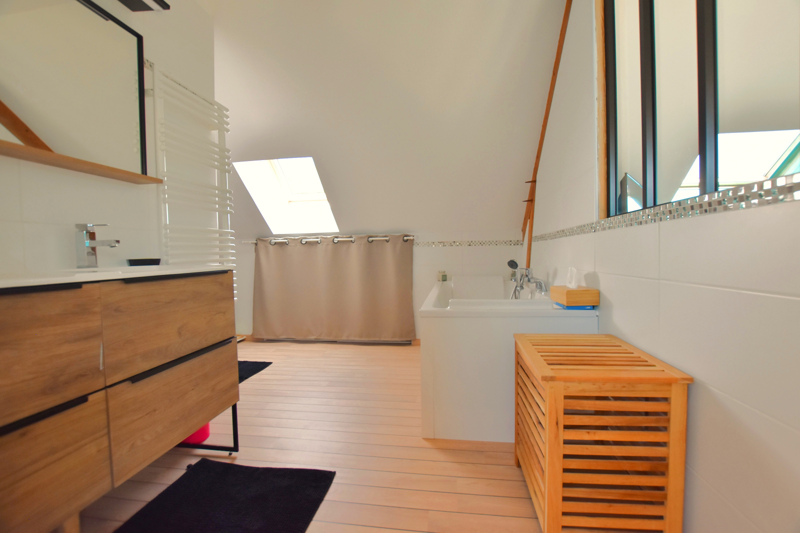 À l’étage, le palier dessert :Une spacieuse SUITE PARENTALE de plus de 44 m², incluant chambre, dressing et salle de bains avec baignoire + douche. Une deuxième chambre de 10,66 m², un bureau, ainsi qu'un WC indépendant.