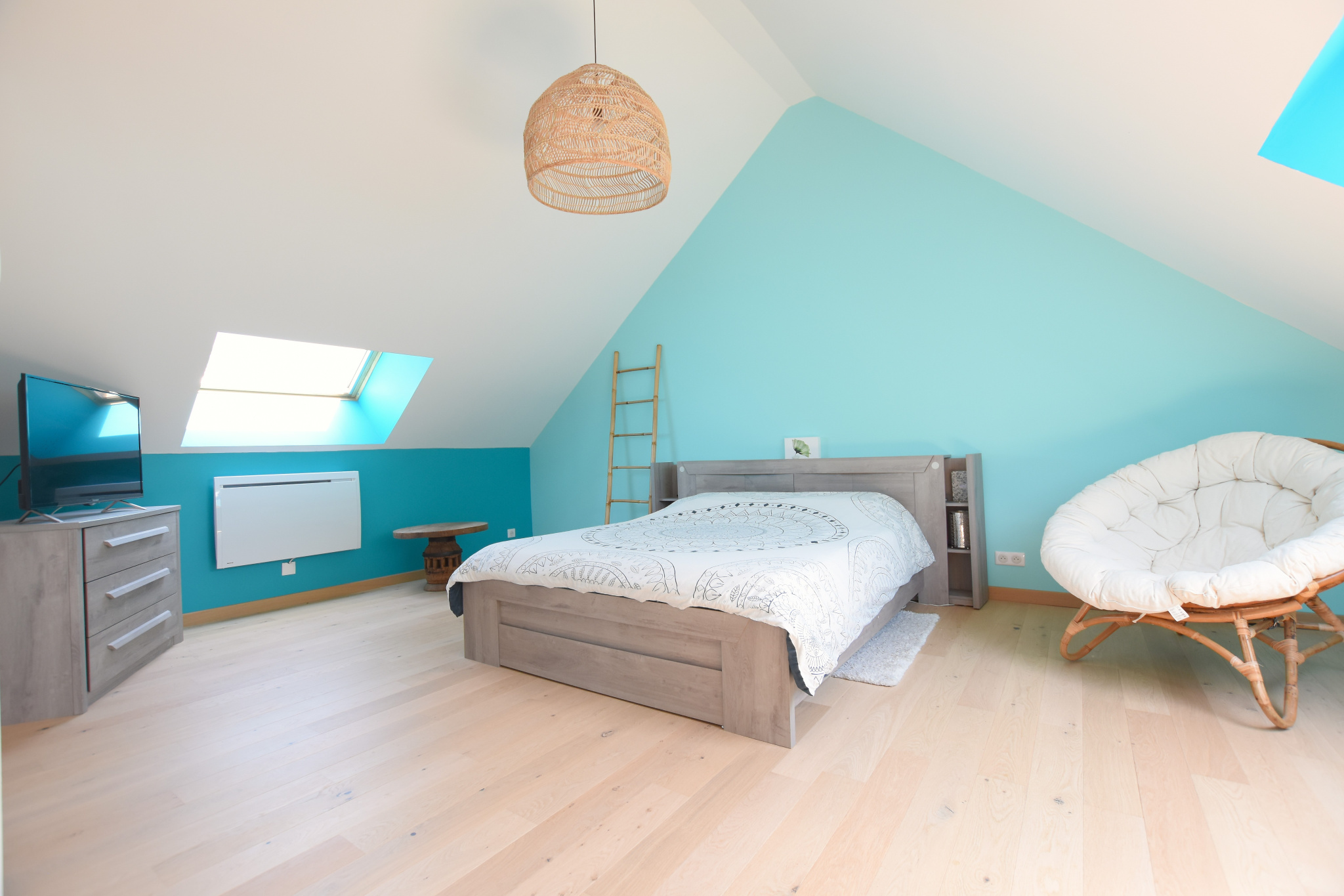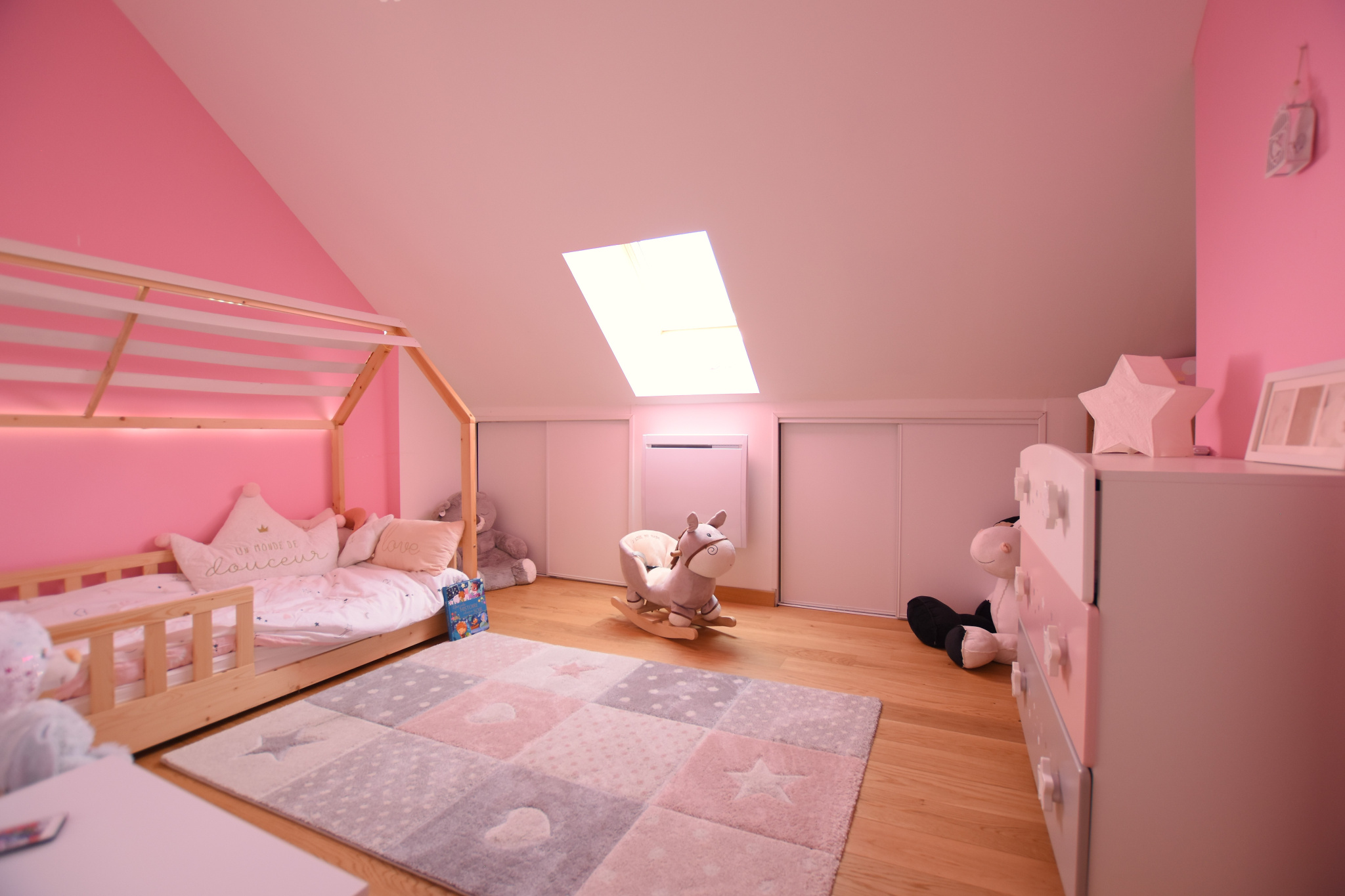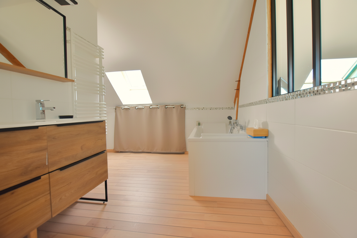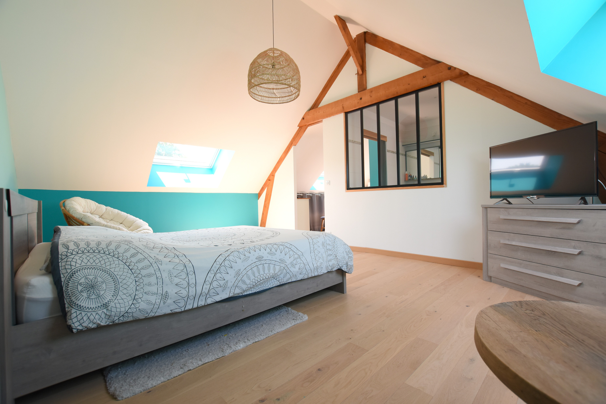 À l’ÉTAGE, le palier dessert une SPACIEUSE SUITE PARENTALE DE PLUS DE 44 m² comprenant chambre, DRESSING et SALLE DE BAINS AVEC BAIGNOIRE + DOUCHE, un véritable espace parental intimiste. Vous trouverez également une 2e CHAMBRE (10,66 m²), un BUREAU et un WC INDÉPENDANT.