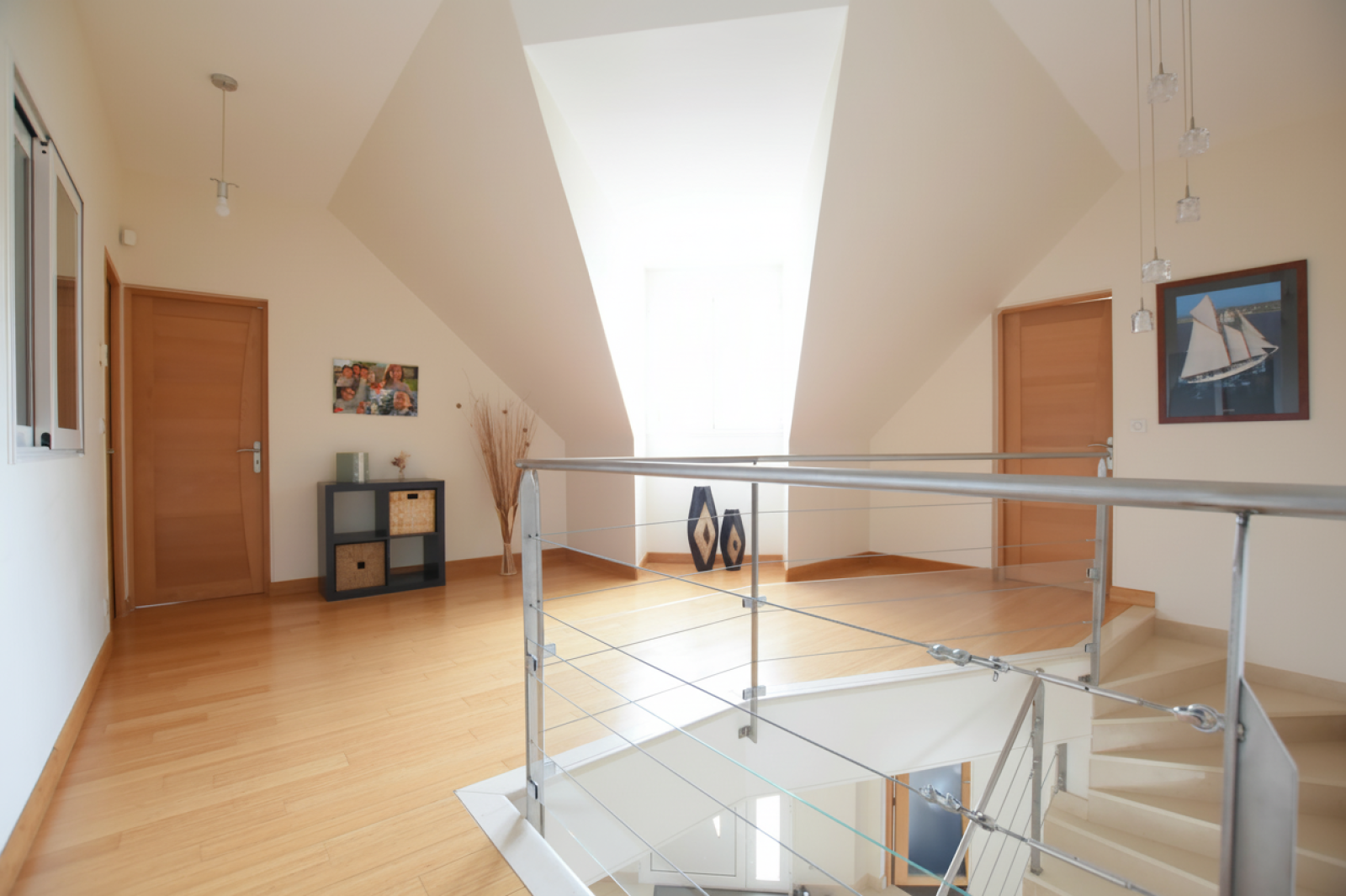 Dès l’entrée, vous découvrez des volumes généreux avec rangements, menant à un SÉJOUR TRIPLE LUMINEUX de plus de 65 m², parfaitement exposé, avec espace salon et salle à manger. La cuisine dînatoire, entièrement équipée, est accompagnée de son cellier pour un quotidien pratique. Toujours au rez-de-chaussée, une SUITE PARENTALE DE 24 m² avec salle de bains (baignoire et douche) ainsi qu’un WC indépendant complètent ce niveau.