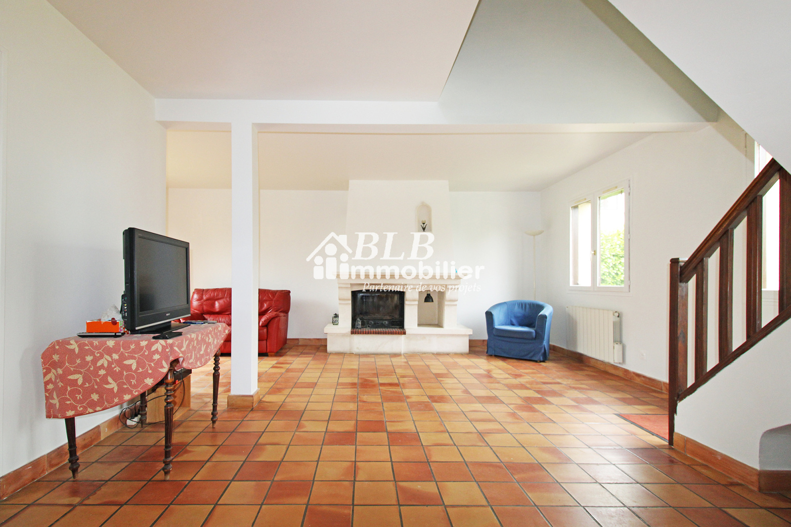 Elle se compose au rez-de-chaussée : d'une entrée avec un placard, d'un salon / séjour avec sa cheminée à insert donnant sur sa terrasse et son jardin arboré, d'une cuisine ouverte, d'un cellier et d'un WC.